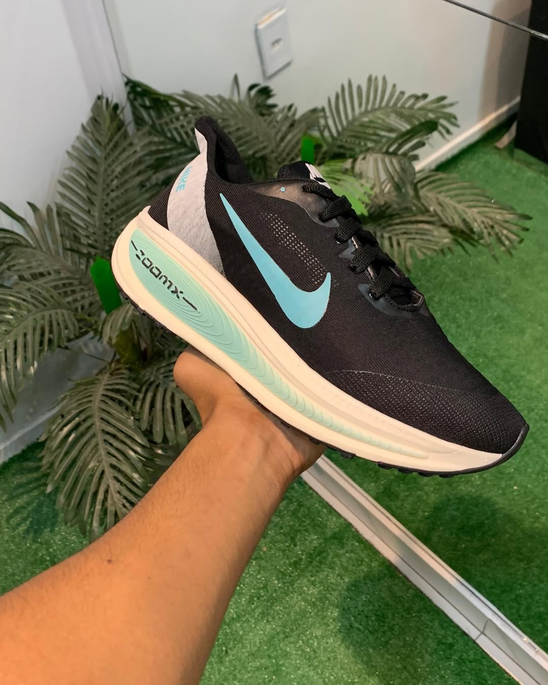 Seja para treinos diários ou para quebrar recordes, o Nike ZoomX em preto e turquesa é a escolha perfeita para corredores que não abrem mão de alta performance e um visual impactante.